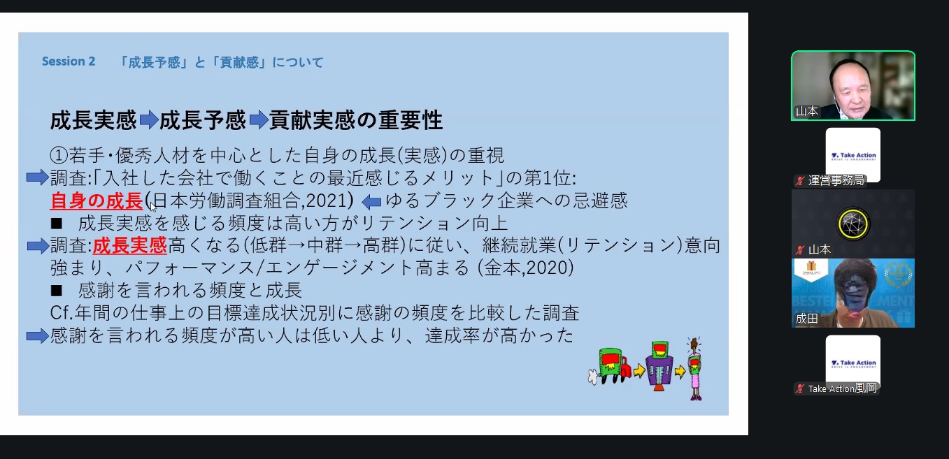 「組織で働く人々のモチベーションと定着」というテーマのオンラインによるトークイベントに登壇してきました。今後求められる人材定着(リテンション)やそのためのマネジメントとは、働く人の成長実感、 成長予感や組織への貢献実感の重要性等についてお話ししました(16:00~16:40)。